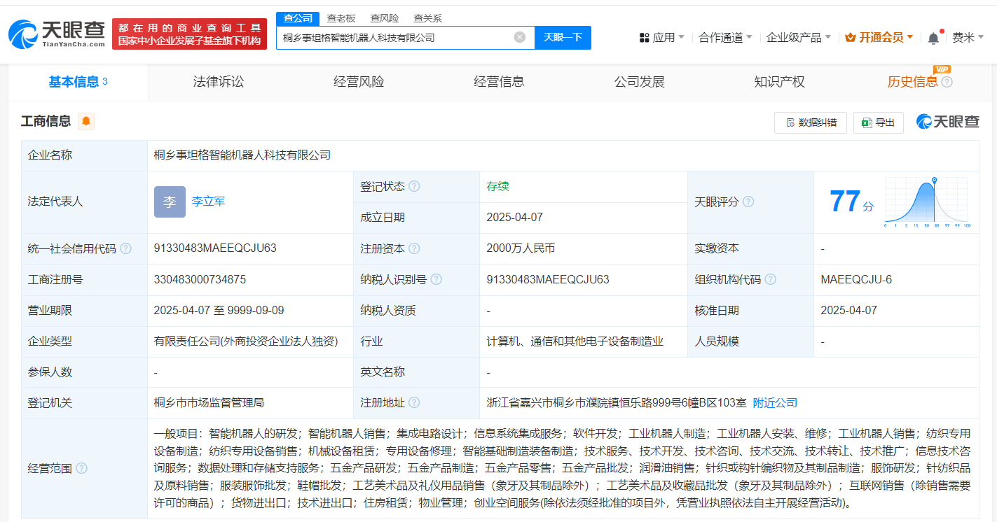 南方财经4月9日电,天眼查App显示,近日,桐乡事坦格智能机器人科技有限公司成立,法定代表人为李立军,注册资本2000万人民币,经营范围包括智能机器人的研发、智能机器人销售、集成电路设计、信息系统集成服务、软件开发、工业机器人制造等,由慈星股份(300307)全资持股。